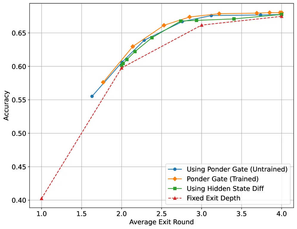 这种机制带来一个意外好处:整体推理效率的提升。因为大部分简单token只需少量循环,只有在遇到真正需要深度推理的内容时,模型才启动更多轮循环。从全局看,平均每个token的计算量远低于固定深度模型。