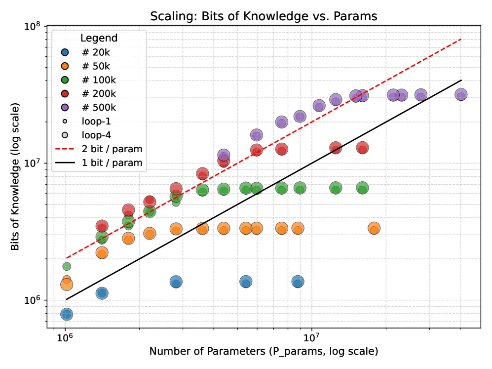 研究团队设计了精心控制的实验来回答这个问题。他们首先考察了一个基础假设:循环是否增加了模型的知识存储容量?通过知识探测实验,系统评估了不同循环次数下模型对事实性知识的回忆能力。结果给出了明确的否定答案:无论循环多少次,模型的知识存储量基本保持不变,始终维持在每参数约2比特的水平。
