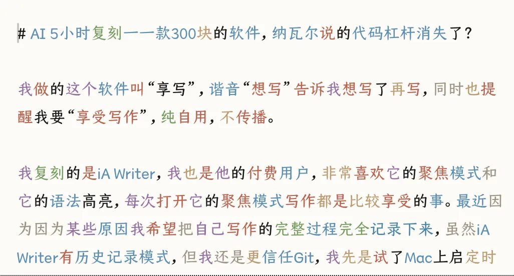 细想一下,目前大部分大量被用户使用的软件,随着AI代码能力提升,门槛都变低甚至没了,这类的软件开发成本骤降,竞争加剧,就像是我复刻的iA Writer,情况一定谈不上乐观。另外一类是软件是载体,本身是靠软件背后的服务的,这种有一定壁垒,但是这种核心其实是背后的服务,这种我甚至不认为是纳瓦尔说代码杠杆范畴。