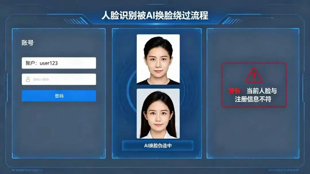 案例警示:南京市民朱先生账户被盗刷 15996 元,嫌疑人仅用其公开照片,通过 AI 换脸工具生成动态人脸视频,成功绕过电商平台人脸识别,完成登录、改密、消费全流程。浙江警方更破获利用 AI 换脸批量破解电商店铺实名认证的黑产链,涉案金额超十万元。
