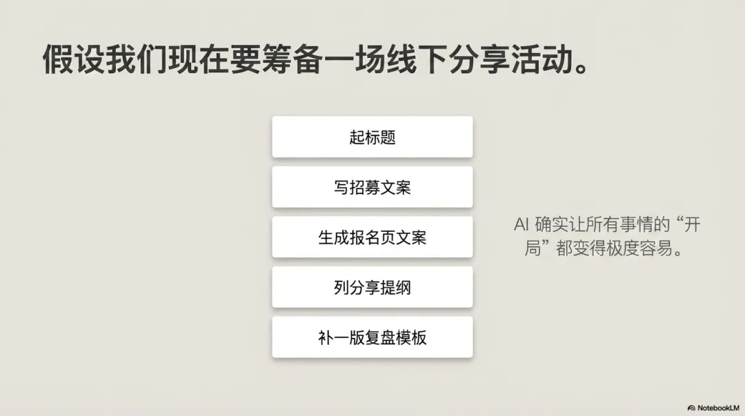 AI会输出类似这样的列表:确定主题和受众 → 设计宣传标题 → 撰写招募文案 → 制作报名页 → 现场流程设计