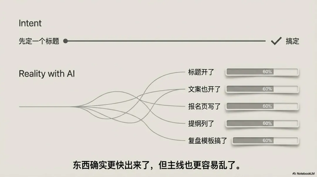 现在AI让你十分钟就能开五个头,于是你同时开启了五个任务。