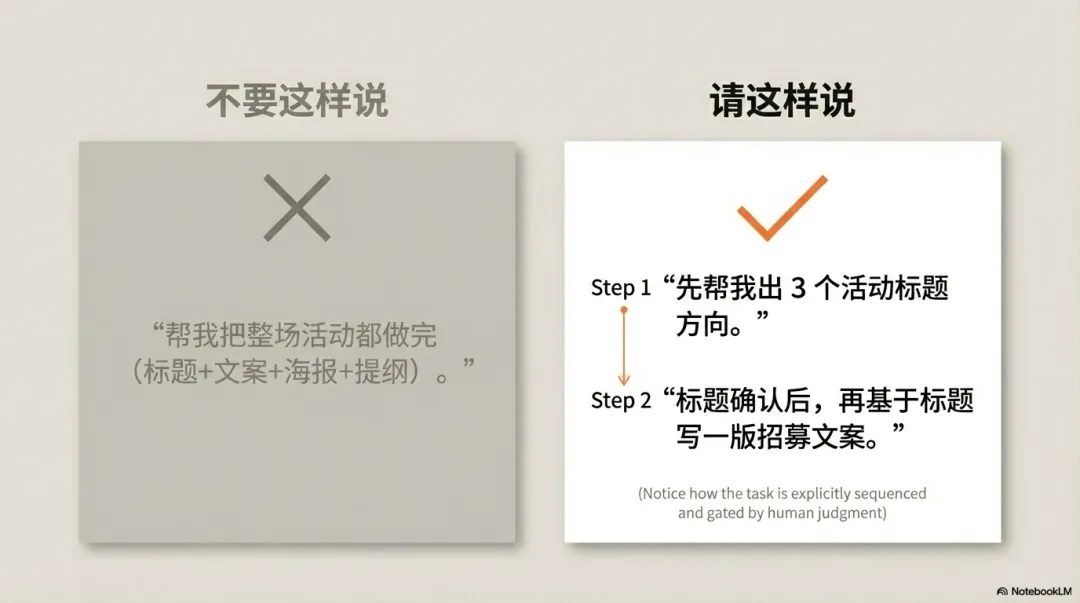错误做法:"帮我筹备一个线下分享活动。"(一次性抛出完整任务)