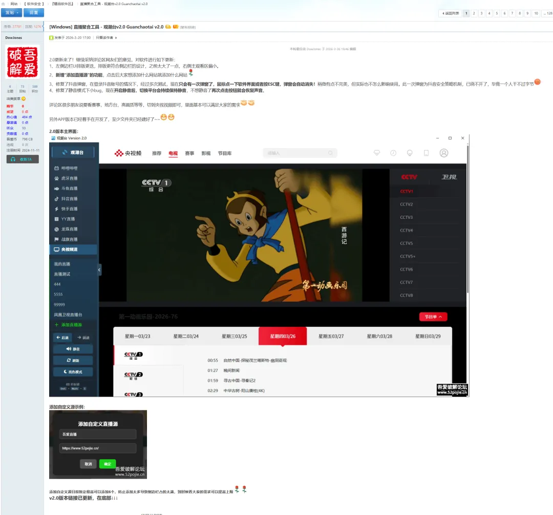 说起这个,想起之前木下在逛 “吾爱破解” 论坛发现的一个直(摸)播(鱼)聚合神器,实际看球看直播真的不错,甚至还能看电视。