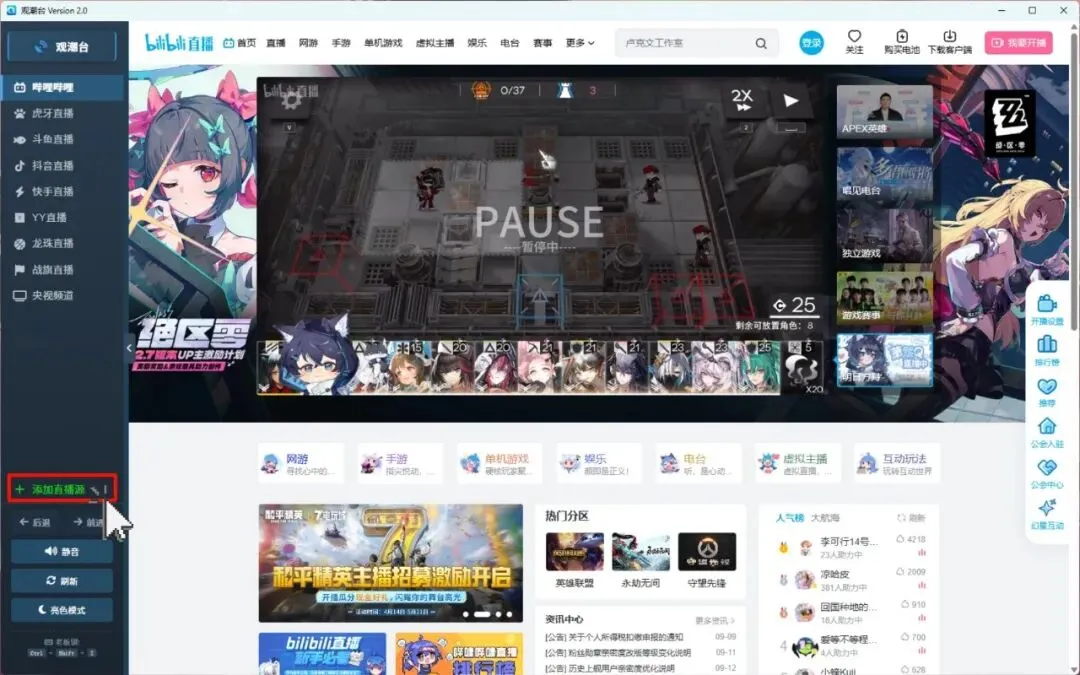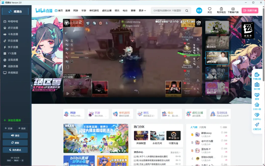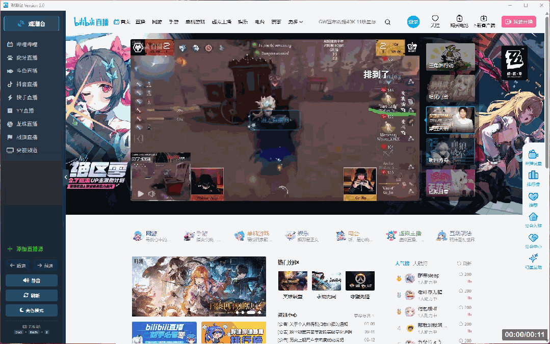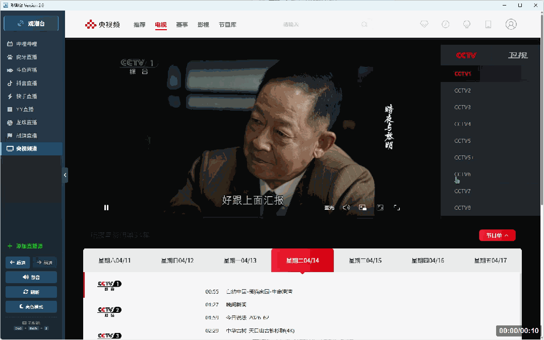 目前软件支持哔哩哔哩、虎牙、斗鱼、抖音、快手、YY、龙珠、战旗、央视等直播源,基本可以满足各种的直播需求了。