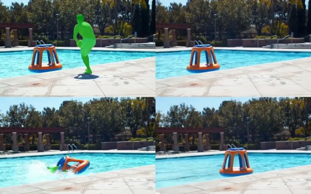 论文展示了几个令人印象深刻的案例。在两车对撞的视频中,VOID可以移除其中一辆车,生成剩余车辆继续沿公路行驶的画面,碰撞后的碎片、烟雾和火焰全部被替换为干净的路面;移除一个跳入泳池的人后,输出的视频里泳池水面波澜不惊。气球在持有者被移除后会自然上升,积木在不相关积木被移除后仍保持稳定。通常情况下,人的触碰一旦消失,物体就会发生变形,而VOID正是为解决这一问题而生。