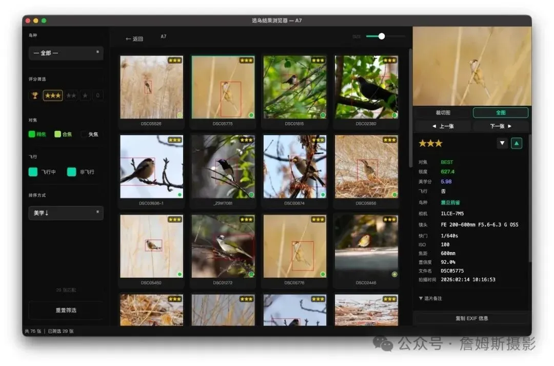 自带选鸟结果浏览器,处理完直接在里面翻片挑片,不依赖任何第三方软件。