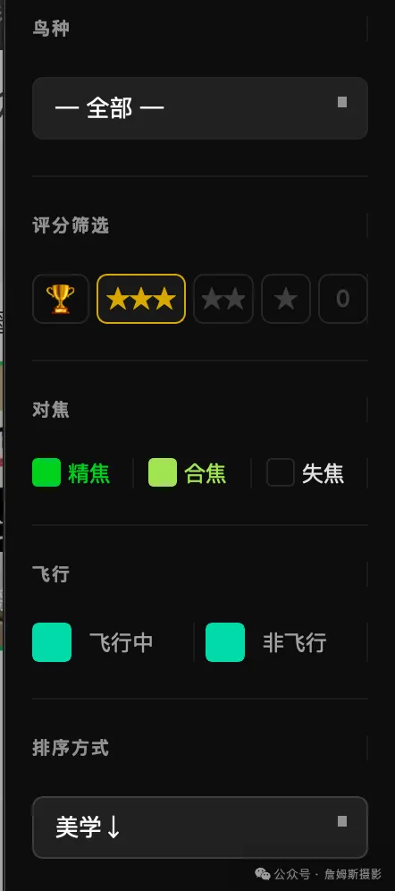 • 左侧按星级、对焦状态、飞鸟、鸟种筛选 - ●