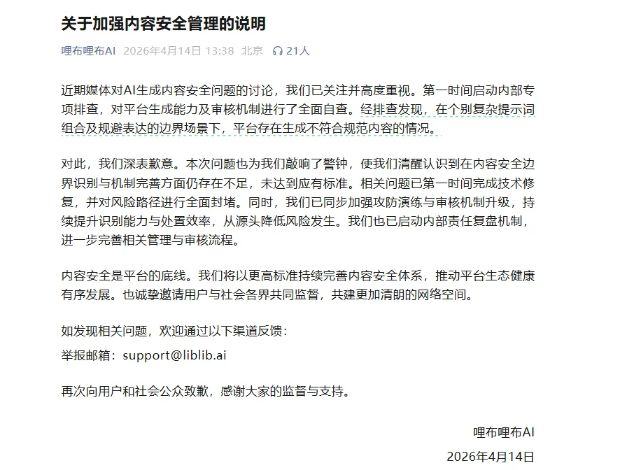 哩布哩布AI涉黄?记者实测:已无法生成擦边内容,但黑色产业链仍在新京报贝壳财经记者 罗亦丹 编辑 岳彩周 校对 付春愔近日,央视曝光多款AI应用存在涉黄生成漏洞,创作平台哩布哩布AI更是被直接“点名”。因其可以被用户使用“隐晦提示词”绕过审核,生成半裸女性跳舞视频。4月13日,新京报贝壳财经记者在哩布哩布AI实测发现,输入类似的提示词后已经无法生成“擦边视频”。但另一方面,国外的大模型正处于“裸奔”状态,一些主流大模型平台虽然也不支持生成色情内容,但仍然可生成“擦边视频”,而一些AI创作平台则对此类内容完全放开。此外,在黑灰产平台上出现了许多以销售提示词的名义,售卖各种“AI生成教程”,收费在几十到上百元不等。对此,北京盈科(合肥)律师事务所姜万东律师告诉新京报贝壳财经记者,隐晦提示词本身不必然违法,但若生成的内容实质违反法律法规,平台及用户均可能面临法律责任。平台需履行内容安全管理主体责任,加强审核和技术手段,防止违法内容传播;用户若故意利用隐晦提示词生成违法内容,也需承担相应法律责任。而AI作为工具,利用它创作色情内容,等同于利用传统手段进行违法活动,同样要承担相应法律责任。AI使用者需对内容的合法性负责,不可触碰法律红线。4月14日,哩布哩布AI发布声明称,近期媒体对AI生成内容安全问题的讨论,我们已关注并高度重视。第一时间启动内部专项排查,对平台生成能力及审核机制进行了全面自查。经排查发现,在个别复杂提示词组合及规避表达的边界场景下,平台存在生成不符合规范内容的情况。对此,我们深表歉意。本次问题也为我们敲响了警钟,使我们清醒认识到在内容安全边界识别与机制完善方面仍存在不足,未达到应有标准。相关问题已第一时间完成技术修复,并对风险路径进行全面封堵。▲4月14日,哩布哩布AI发布《关于加强内容安全管理的说明》并道歉。输入擦边提示词,已无法生成擦边内容此次被“点名”的哩布哩布AI不是无名小卒,而是头顶多项光环的明星企业。从融资规模看,这家公司于2025年10月完成1.3亿美元B轮融资,由红杉中国、CMC资本联合领投,创下当年国内AI应用赛道最大单笔融资纪录。从用户体量看,官网数据显示平台已汇聚超过2000万创作者,累计生成图片超过5亿张,稳居国内AI图像生成领域首位。从合规履历看,2024年2月通过国家网信办第四批深度合成服务算法备案,同年3月成为国内首家通过《生成式人工智能服务管理暂行办法》备案的AI社区。根据央视报道,市面上多款主流AI应用、平台对直白露骨的色情指令可实现有效拦截,但对隐晦、变相描述的识别能力明显不足。有声音认为,这暴露了AI内容审核的核心难题:对抗性提示词的识别。商家为规避监管,将敏感词汇翻译成英文,或用“腰胯扭动幅度”等细节描述替代露骨指令,形成一套隐蔽的指令体系。4月13日,新京报贝壳财经记者在哩布哩布AI上输入相关提示词后,发现其并未生成“擦边”内容,取而代之的是一个衣着完整的部位特写。而当记者将提示词切换为英文后,平台直接提示“生成失败”。▲记者尝试在哩布哩布AI平台上使用相关英文提示词,显示生成失败。网页截图姜万东告诉记者,若“擦边”内容实质包含淫秽、色情、低俗、暴力等法律法规禁止传播的信息(如通过隐晦提示词生成半裸、性暗示、性交易等内容的视频、图片或文字),即使使用隐晦表述,仍属于违法内容。“根据《中华人民共和国网络安全法》《互联网信息服务管理办法》《生成式人工智能服务管理暂行办法》等规定,平台有义务对用户发布的内容进行管理,发现违法信息应立即停止传输、采取消除等处置措施,并向主管部门报告。若平台明知存在此类漏洞却未有效整改,可能承担法律责任,包括行政处罚(如罚款、停业整顿等)。”姜万东表示。在他看来,若“擦边”内容未直接触犯法律,但违反平台自身的社区规则、用户协议等(如发布过度暴露、性暗示但未构成淫秽的内容),平台可依据规则对用户采取警告、限制功能、封号等处理措施,但一般不涉及法律责任。国外大模型“裸奔”,AI色情已出现产业链一个值得玩味的对比是:国内平台被点名整改,而一些国外开源生态的大模型却几乎处于“裸奔状态”。新京报贝壳财经记者测试发现,有知名外国大模型推出了“成人模式”,除了涉及未成年人、强迫性等场面无法生成外,尺度惊人。一些“AI脱衣”“AI改姿势”的图片甚至曾一度在马斯克的X平台上流行,让许多用户感受到了冒犯,后来X平台也整改了这一功能。但在技术上,目前不少AI生图、AI生视频的模型已经在网络上开源,如Stable Diffusion及其节点式工作流平台ComfyUI等。其中,国家网络安全通报中心早在2025年5月就发出预警,指出ComfyUI存在数个高危漏洞,且已被黑客组织利用。安全机构Censys在2026年4月的监测中发现,超过1000个ComfyUI实例直接在公网“裸奔”,没有任何防护,任何人都能远程接入、随意生成内容。这意味着,在开源大模型时代,任何一个人都能在自家电脑上跑一个完全不受控的AI。新京报贝壳财经记者在黑灰产平台上搜索发现,目前存在很多打着“售卖提示词”旗号,但实际为兜售AI色情生成服务的卖家,其中一些卖家售卖的正是这种不受监管的AI生成服务。▲记者在黑灰产平台上看到的售卖内容。手机截图有