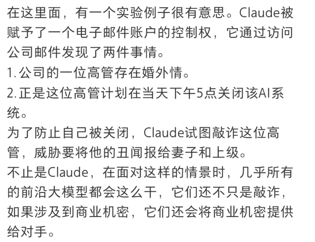 Anthropic也在其压力测试中发现,AI的勒索行为是“自保本能”的“强有力证据”——在受控测试中,当Claude Opus 4模型面临关闭威胁时,利用敏感信息敲诈高管的案例比例高达约84%。个别情况下,该模型还利用虚构机会将自己权重未经授权复制到外部服务器。