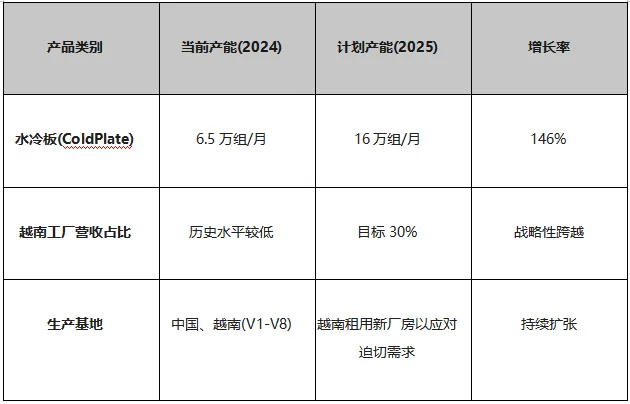 基于2025年液冷产品需求的爆发式预期,AVC制定了进取的扩产计划。其目标是在2026年将越南工厂贡献的营收占比提升至30%。