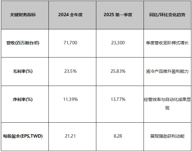 2024年全年度,AVC实现营收717亿新台币,毛利率维持在23.5%的健康水平。进入2025年第一季度,随着液冷产品出货比例的提升,公司毛利率显著攀升至25.83%,净利率达到13.77%。