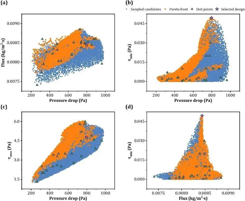基于SVR模型开展多目标优化,获得面向不同优先级的最优结构(表2,图3),其中以τmin最大化为核心的耐结垢方案为Xs=0.80、Ys=0.80、Zs=1.25、θz=47.8°,帕累托前沿验证该方案处于非支配区域(图4),兼顾高剪应力、高通量与可接受压降。有效消除了传统隔网易结垢的低剪切区域,为后续抗结垢性能提升奠定了动力学基础。