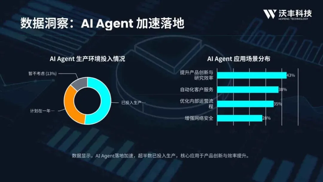 - 生产环境投入:超过半数的AI Agent已投入生产环境,核心应用场景包括提升产品创新与研究效率(43%)、自动化客户服务(38%)及优化内部运营流程(35%)。