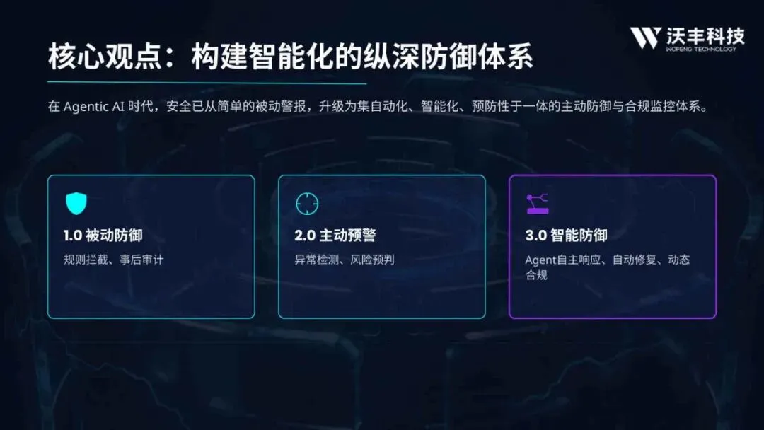 - 阶段升级:安全防御从1.0被动防御(规则拦截)和2.0主动预警(异常检测),升级为3.0智能防御(Agent自主响应、自动修复、动态合规)。