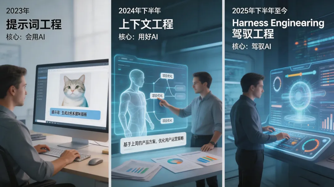 第一阶段(2023年):提示词工程,核心是“会用AI”。这一阶段的关键是通过精准的提示词指令,让AI输出符合需求的结果,评判标准在于提示词的专业度,也是新手入门AI的基础。 第二阶段(2024年下半年):上下文工程,核心是“用好AI”。随着AI智能化提升,无需繁琐的提示词,只需提供足够详细的上下文(如需求背景、客户画像等),就能获得更精准的输出,这也是当前多数人使用AI的主流阶段。 第三阶段(2025年下半年至今):Harness Engineering(驾驭工程),核心是“驾驭AI”。这一阶段的核心是将AI与知识库、工作流结合,让AI成为可管控的“执行单元”,而非单纯的对话工具。唐博士形象地将其比作“训小孩”,通过“负面提示词”管控AI,避免无效输出,而OpenClaw作为自主智能体的代表,正是这一阶段的核心实践工具。