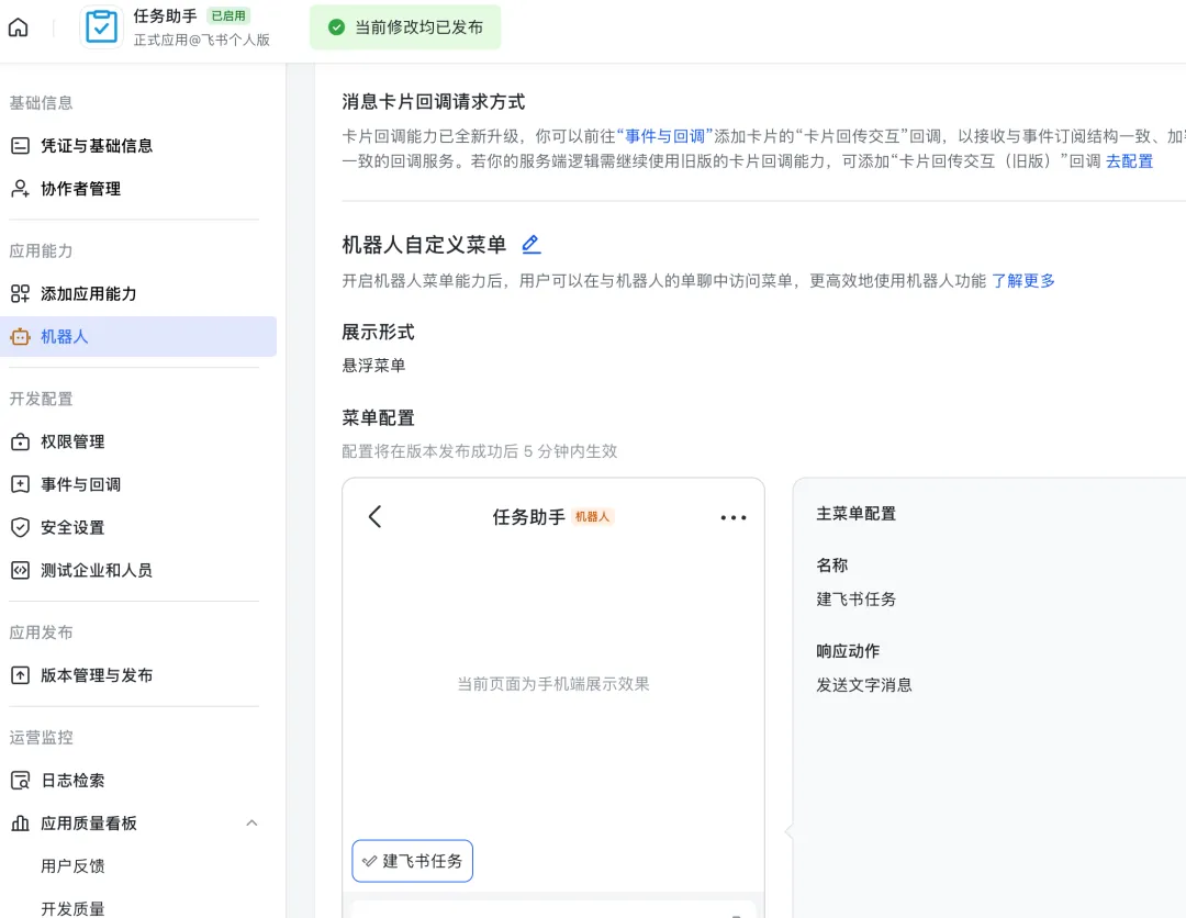 路径:应用详情 → 「机器人」→ 「自定义菜单」→ 「添加菜单」