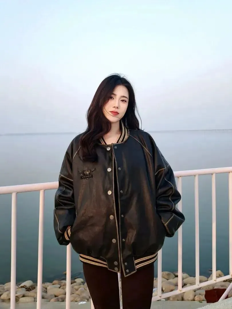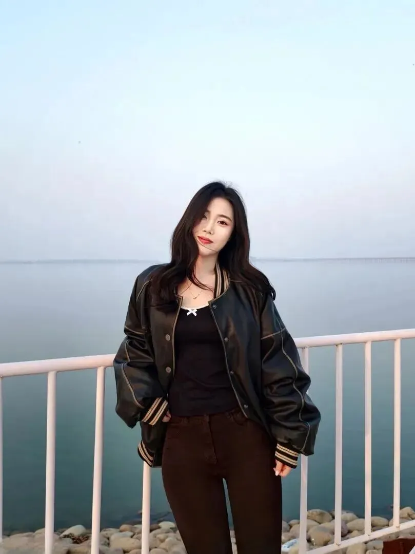 想要帅一点风格?试穿皮质棒球服。黑色皮衣本身便有独特气场,浅棕色条纹加上明线,衣服就不会太过沉闷。里面套着一件黑色吊带,胸前挂着一个蝴蝶结,一下子就多了一份甜蜜。下身为深棕色修身牛仔裤,腿直身高。站在水边的时候,微风吹拂之下,我身上的一根一根的发梢都随着风儿而轻轻飞扬。尤其让人赏心悦目的是这样一种流露,即一种不刻意的随意性。手插在口袋里或者自然放下都可以,都很好看。