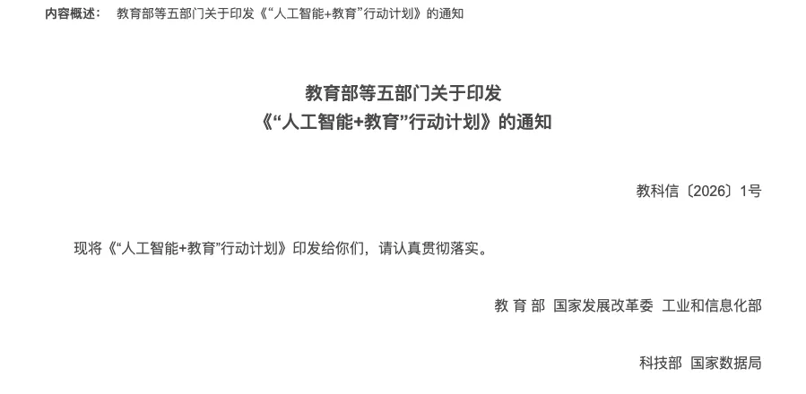 教育部等五部门《"人工智能+教育"行动计划》全文(教育部官网):http://www.moe.gov.cn/srcsite/A16/s3342/202604/t20260410_1433240.html