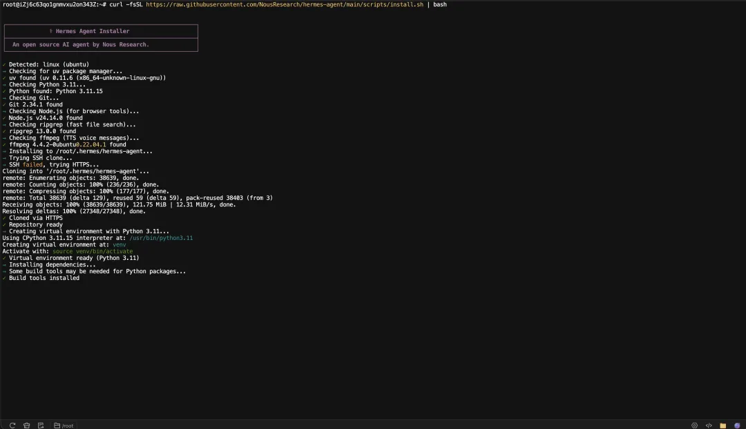curl -fsSL https://raw.githubusercontent.com/NousResearch/hermes-agent/main/scripts/install.sh | bash