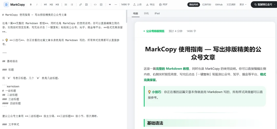 一个markdown转微信公众号格式的工具。有十几套主题可供选择。
