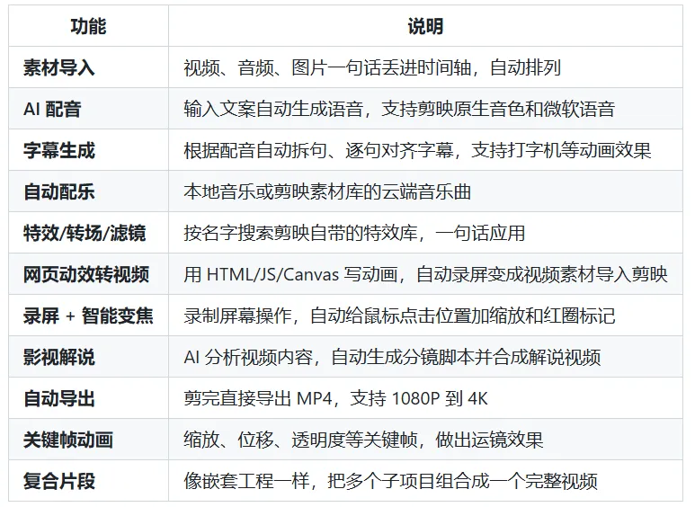 只需用自然语言告诉 AI 你想做什么视频,就自动帮你完成从写文案、配音、加字幕、选音乐、上特效到最终导出的整套流程。