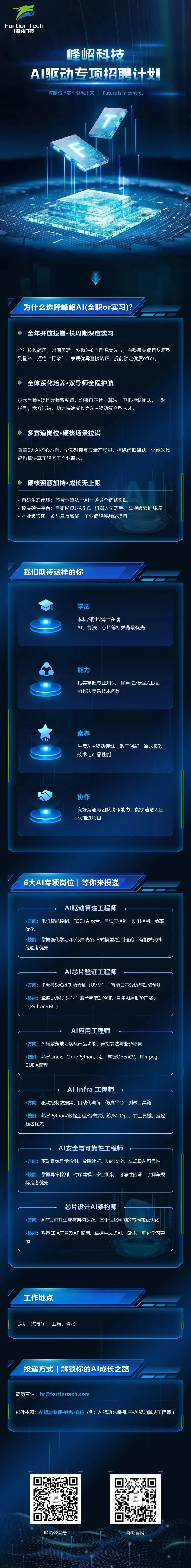 实习生招聘|26春招 峰岹科技AI驱动专项招聘计划(AI芯片验证,芯片设计建构师,驱动算法,应用, infra,安全与可靠性)↑ 点击上方蓝字关注我们获取更多信息投递入口:可通过底部链接,直接投递峰岹科技(深圳)股份有限公司(688279.SH / 01304.HK)峰岹科技(深圳)股份有限公司(简称“峰岹科技”)成立于2010年,是一家专注于高性能BLDC(无刷直流)电机驱动控制芯片设计、研发与销售的高新技术企业,致力于成为全球领先的电机驱动控制芯片和控制系统供应商。公司于2022年在上海证券交易所科创板上市,并于2025年在香港联交所主板挂牌上市。2025年,公司实现营业收入7.74亿元,同比增长28.91%;归属于上市公司股东的净利润2.19亿元;研发投入1.69亿元,占营业收入比重21.86%。一、业务范围峰岹科技的业务以BLDC电机驱动控制芯片为核心,提供从芯片到系统级解决方案的全链路服务,并持续向高附加值应用领域拓展。核心产品线:公司产品涵盖电机驱动控制的全部关键芯片,包括电机主控芯片MCU/ASIC、电机驱动芯片HVIC、电机专用功率器件MOSFET等。公司以芯片设计为立足点,为客户提供专用芯片、相适配的架构算法以及电机结构设计方案在内的系统级服务。应用领域:消费电子与家电:在智能小家电、电动工具、运动出行等传统优势领域持续巩固市场份额,2025年销售占比53.48%,是公司业绩的“压舱石”。白色家电(洗衣机、空调、冰箱)领域销售收入稳步增长。工业控制:2025年收入占比提升至15.62%,保持高速增长态势。产品应用于工业自动化、机器人等领域。前沿技术布局:2025年,公司重磅发布FU75XX系列芯片——业界首款基于32位RISC-V双核架构的电机驱动专用MCU,融合第二代电机控制引擎(ME2),适配机器人应用场景。公司与三花控股集团设立合资公司,聚焦空心杯电机领域研发与产业化,成功实现人形机器人关节核心技术方案的突破。二、市场地位峰岹科技是中国BLDC电机驱动控制芯片领域的领先企业,技术壁垒深厚。BLDC电机驱动控制芯片的领先者:公司凭借多年沉淀的技术积累、自主创新的驱动控制算法及全链路的系统级解决方案能力,在消费电子等基础市场占据行业领先地位。汽车电子领域的快速突破者:2025年,公司汽车电子业务实现跨越式增长,车规级芯片营收占比已接近12%,标志着其成功切入汽车这一高壁垒、高增长市场。高研发投入的技术驱动型公司:2025年研发投入同比增长44.90%,占营收比重高达21.86%。截至2025年末,公司累计取得境内外专利138项,其中发明专利85项。三、未来发展空间公司正处在从消费电子优势领域向工业、汽车、机器人等高成长赛道加速拓展的黄金期。深度受益于汽车电动化与智能化:全球汽车产业转型推动BLDC电机在热管理、车身控制、底盘系统等场景的渗透率快速提升,车规级电机驱动芯片市场需求迎来爆发式增长。公司已实现多款产品量产上车,未来份额有望持续提升。工业控制与机器人打开全新增长空间:工业自动化升级和机器人产业发展,对高性能、高可靠性的电机驱动芯片提出巨大需求。公司发布的RISC-V架构专用MCU及在空心杯电机领域的布局,精准卡位了这一未来赛道。白色家电等传统市场稳步渗透:在洗衣机、空调、冰箱等白色家电领域,公司产品渗透率持续提高,该板块业务保持稳步增长,为公司提供稳定的现金流。总结:峰岹科技是中国电机驱动芯片细分领域的“隐形冠军”。其核心竞争力在于对电机驱动架构、芯片设计和电机本体技术的深度融合理解、在消费电子市场建立的稳固基本盘,以及向汽车、工业等高壁垒市场快速拓展的执行力。短期增长动力来自汽车电子业务的超预期放量和工业控制领域的持续高增长;中长期发展则取决于其能否抓住机器人产业爆发的机遇,将在电机驱动控制领域的核心技术优势,成功复制到人形机器人等未来产业的核心部件中,从而打开巨大的估值和成长空间。