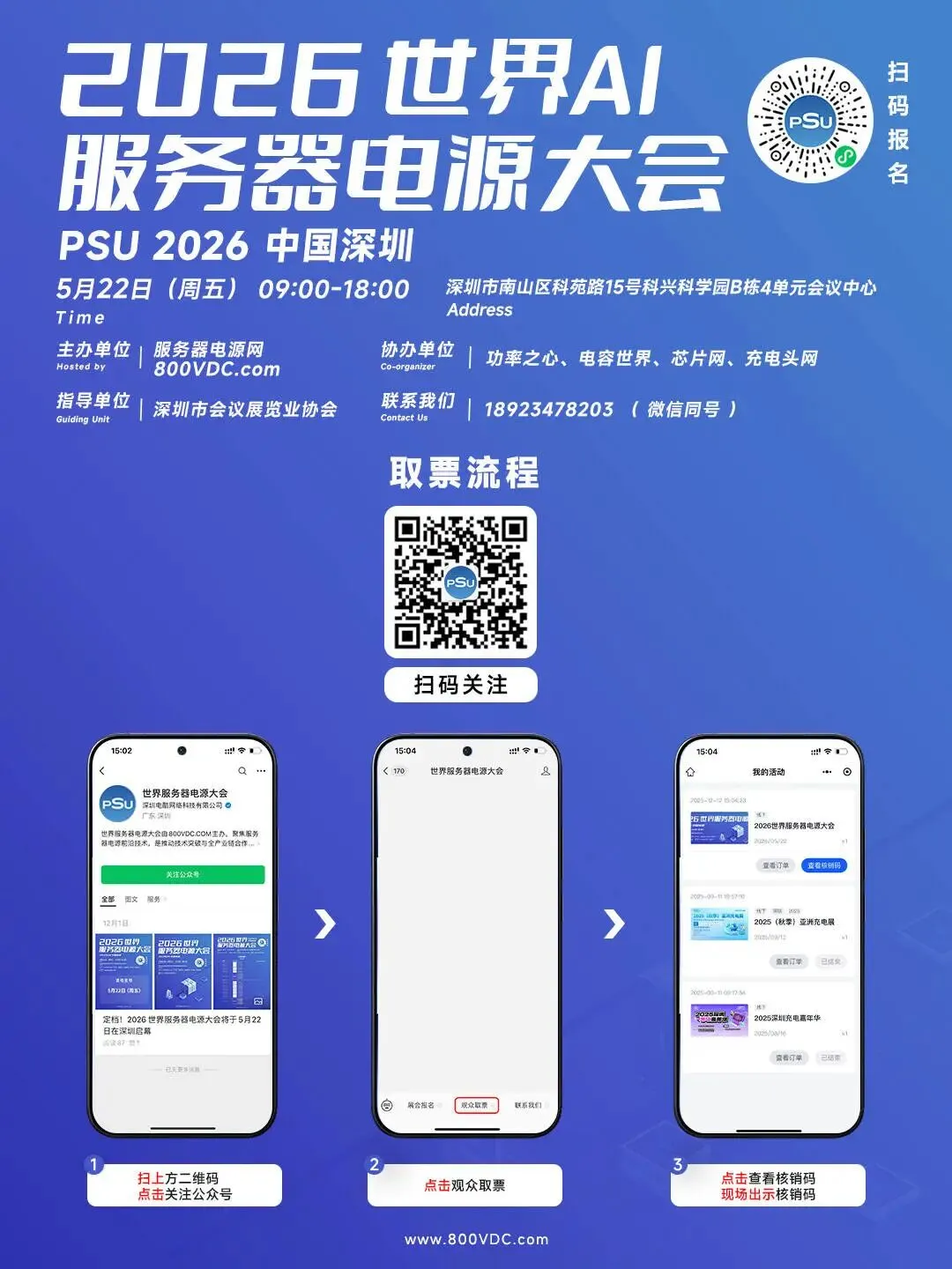 参会嘉宾可提前扫描海报上方二维码关注大会公众号并完善报名信息,现场出示公众号内的电子核销码即可快速入场。