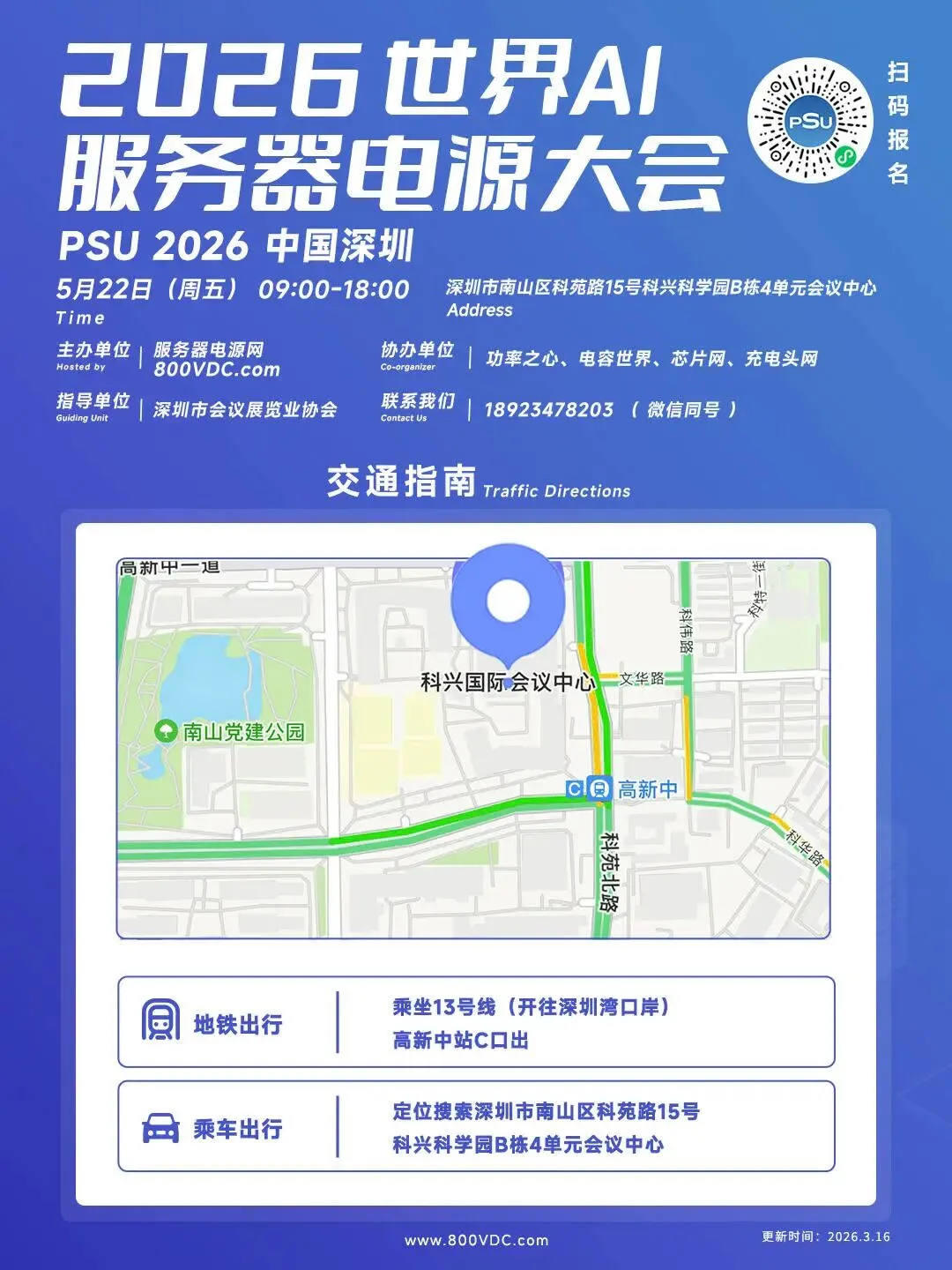 本次大会会场设于深圳市南山区科兴科学园 B 栋 4 单元会议中心,园区内设临时停车区域,可选择乘车或搭乘地铁 13 号线至高新中站 C 口前往(高峰时段园区停车位相对紧张),请记得提前 30 分钟抵达会场,预留充足时间完成签到,顺利开启本次算力供电技术交流之旅。