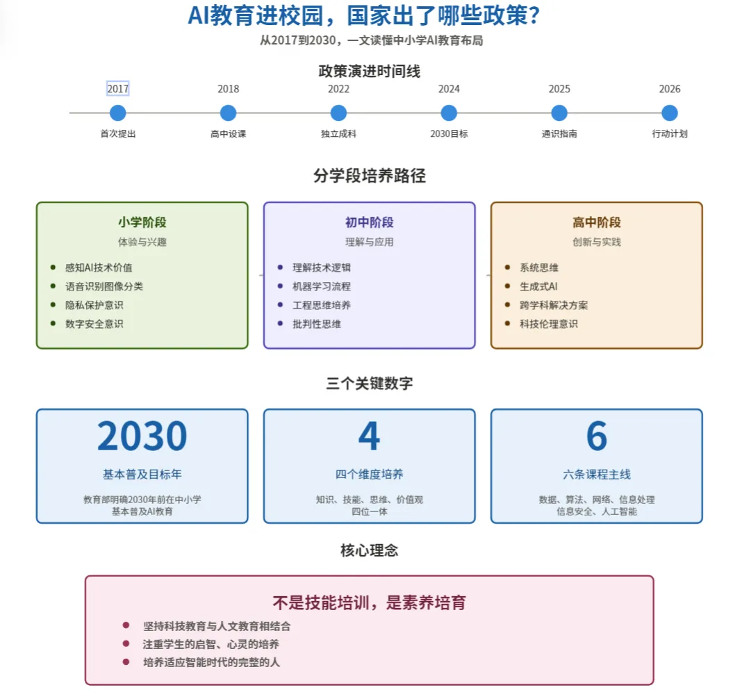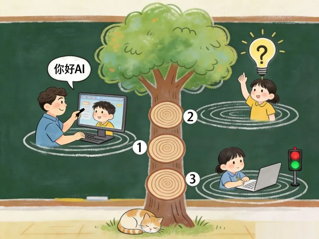 2025年5月,教育部同时发布两份重磅文件——《中小学人工智能通识教育指南》和《中小学生成式人工智能使用指南》,第一次从国家层面构建了从小学到高中的AI通识教育体系:小学阶段重兴趣启蒙,初中阶段重原理认知,高中阶段重创新实践。