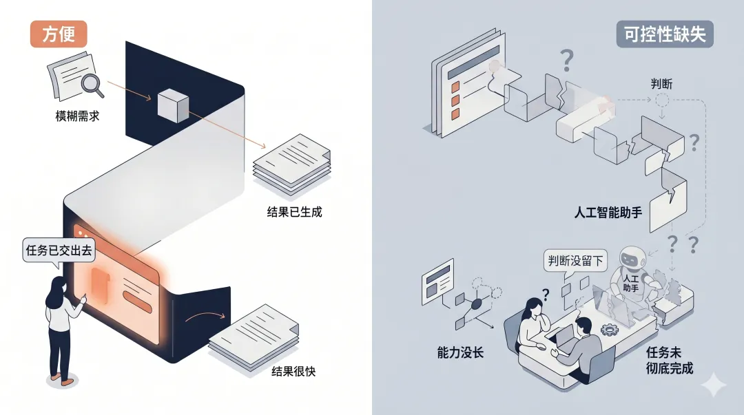 放到日常工作里,它未必表现成「我不会用 AI」,更常见的样子其实是:我能把它用起来,但我说不清为什么这次能成、下次为什么又不稳。