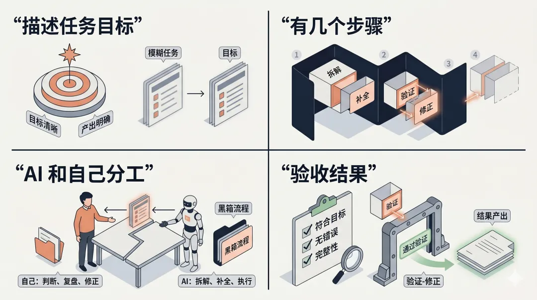 这类任务的目标是什么? 通常按哪几个步骤推进? 哪一步交给 AI,哪一步必须自己判断? 最后用什么标准验收结果?