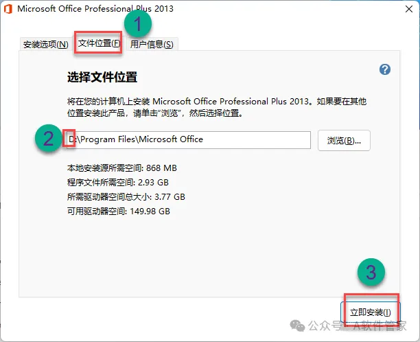 6.①点击【文件位置】;②点击【浏览】可以选择软件安装位置或者直接修改路径地址中的首字符,例如将C改为D,软件将安装到D盘);③点击【立即安装】。