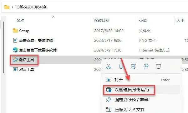 9.打开【步骤1】中,安装包解压后的【Office2013(64bit)】文件夹,鼠标右击【激活工具】选择【解压到当前文件夹】。