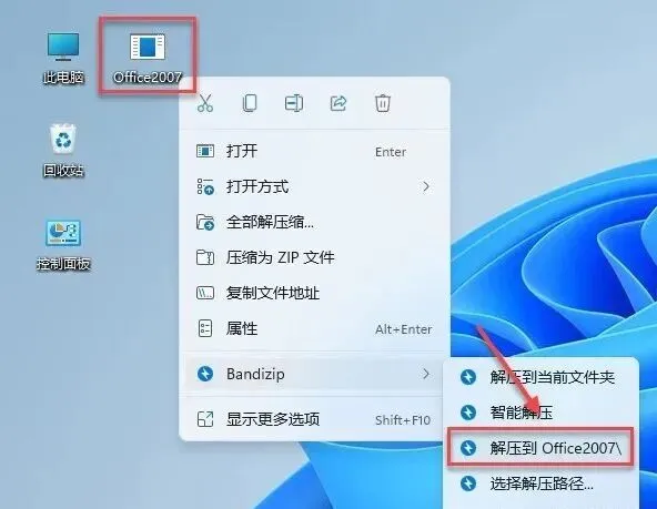 1.选中“Office2007软件安装包”压缩包,鼠标右击,选择“解压到Office2007软件安装包”。