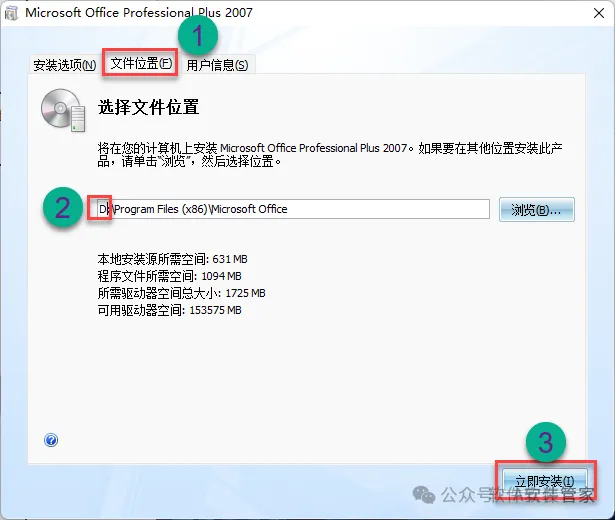 7.①点击【文件位置】;②点击【浏览】可以选择软件安装位置或者直接修改路径地址中的首字符,例如将C改为D,软件将安装到D盘);③点击【立即安装】。