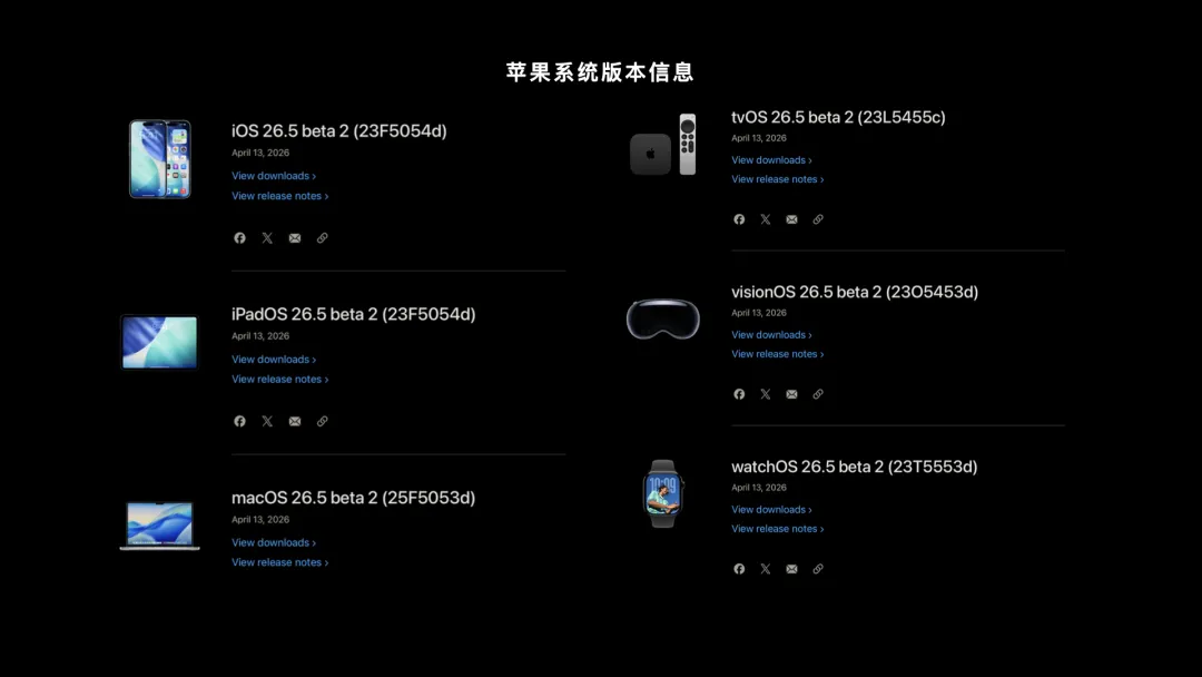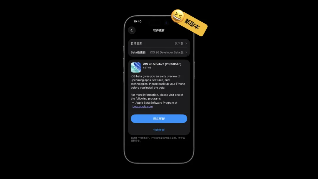 今日凌晨,苹果发布了 iOS 26.5 Beta 2 版本, 版本号为 23F5054d。 同时还发布了 iPadOS 、macOS 等其它系统的 26.5 Beta 2 测试版本。