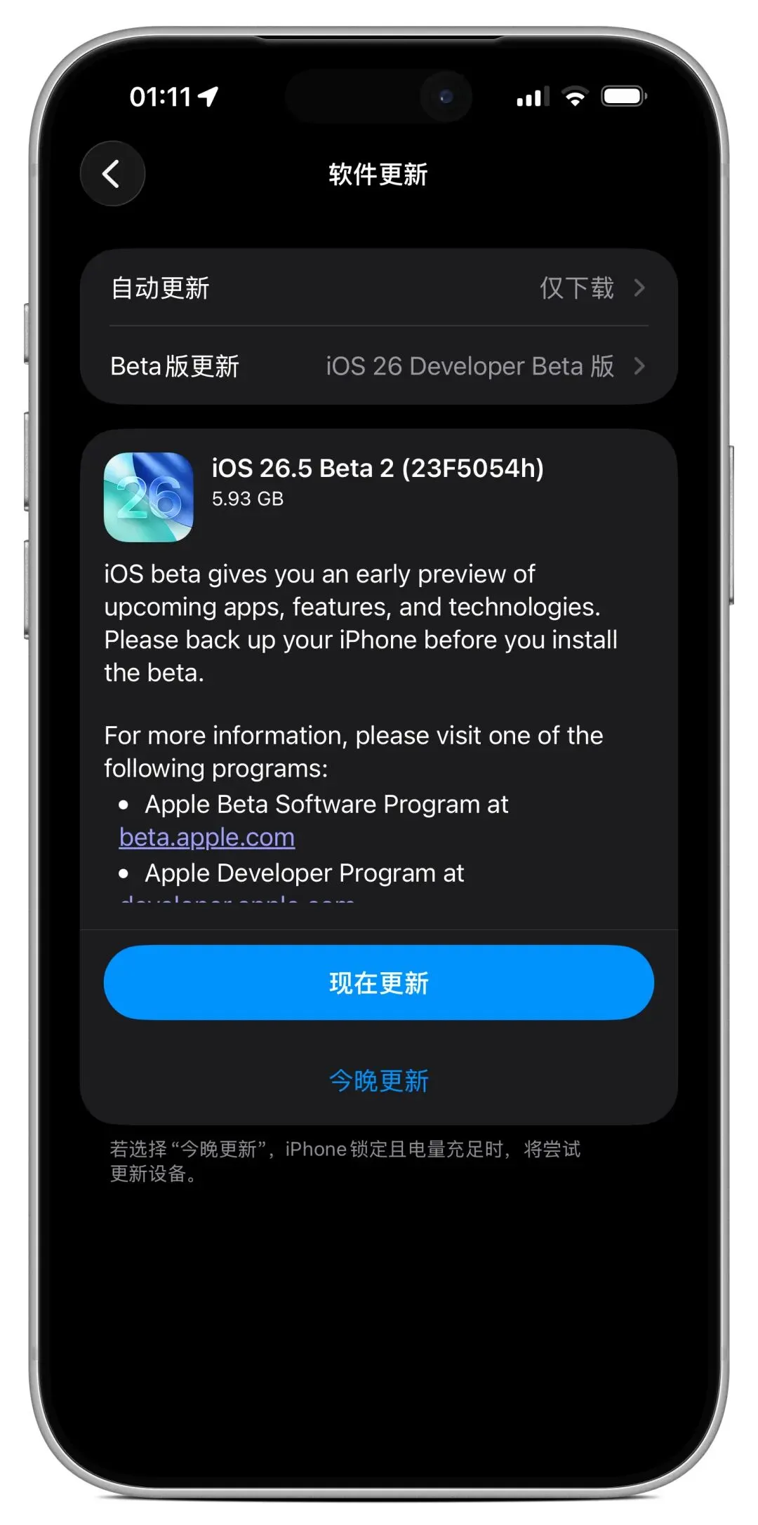 4月14日凌晨,苹果向开发者推送iOS 26.5 Beta 2更新,内部版本号23F5054h,距离上一版Beta 1间隔两周。同时iPadOS、macOS、watchOS等全平台测试版同步更新。本次更新无重大功能新增,反而引入了影响体验的Bug,同时为苹果地图广告功能做了最终准备。