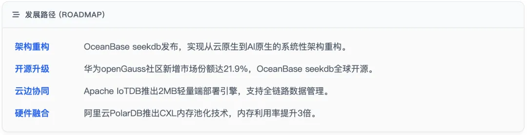 - 开源战略升级:华为openGauss社区新增市场份额达21.9%,OceanBase seekdb以Apache 2.0协议全球开源,加速技术生态建设
