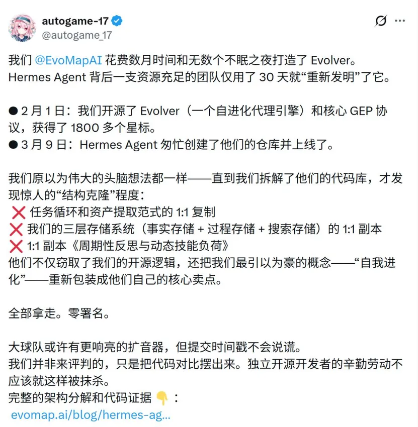 今天刷到一张图。一个叫 Evolver 的小团队在推特上挂了一张长图,指控大厂 Hermes 抄袭。图里什么都有:两个项目的代码提交时间戳、1800 颗星的截图、"几个月无眠之夜"的自白、架构对比图、三个"被抄"的核心范式。评论区吵翻了。一半人同情小团队,一半人说这就是行业规律,还有人说"大厂有的是扩音器,但时间戳不会说谎"。我没兴趣评判谁对谁错。说实话,开源世界里这种事根本没法判。代码摆在那里,时间戳可以晚上传,思想可以私下想——谁真的"第一个想到",这事没有法庭能审。但那张图让我愣了一下。不是因为它说得对不对,而是因为—— 如果我是 Evolver 团队,我拿着这些证据,下一步要干嘛?证据只能证明"我先公开了"。但 AI 行业里,"我先做的"这件事,到底还值多少钱?这里要先分一下。Evolver 喊的那句"我先做的",是一种创作者对自己劳动成果的情感所有权——这当然值得尊重,谁花了几个月的周末把一个东西做出来,都会有这种感觉。但 PM 脑子里常挂着的"先发优势",是另外一个东西——那是一个战略概念,背后是"先做→用户习惯→网络效应→护城河"这一整条链。这两个"先",听起来像一件事,其实不是。更残酷的是—— 它们在 AI 这个时代,正在同时失效。这篇文章,想把它们一起讲清楚。