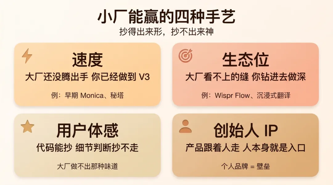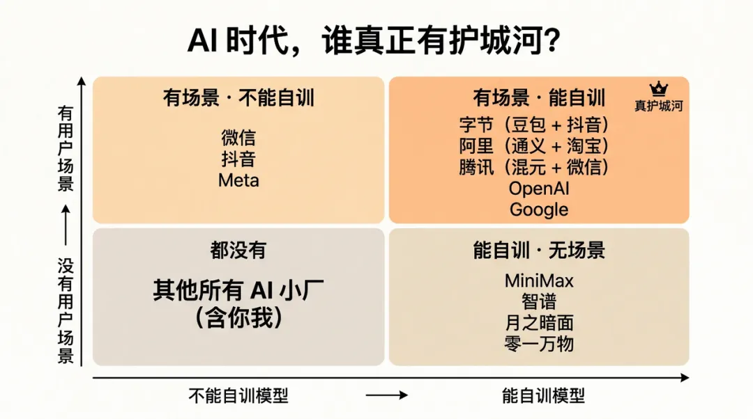 | 真正有护城河的只有两种公司那到底什么公司是有护城河的?就两种:第一种是能训模型的OpenAI、Anthropic、Google 这种。算力、数据、研究员,三样齐备。他们的护城河不是架构设计、不是产品形态,是那个几亿美金的训练集群和站在集群背后的那些人。这些东西你想抄都不知道从哪下手。第二种是有用户场景的微信、抖音、Meta 这种。入口是他的,AI 只是附加能力。就算他自己不训模型,他也可以接任何一家模型公司的能力,然后把 AI 无缝塞进他现有的几亿用户面前。场景本身就是护城河。国内的情况怎么看?字节、阿里、腾讯是两样都沾的。字节有豆包(自训模型)加上抖音/TikTok(场景);阿里有通义(自训模型)加上淘宝/钉钉(场景);腾讯有混元(自训模型)加上微信(场景)。这三家是中国真正有 AI 护城河的公司。然后是"只有一半"的——MiniMax、智谱、月之暗面、零一万物。它们能训模型,但没有自己的用户场景。所以它们现在也在焦虑——模型再好,用户在哪里?这就是为什么它们最近都在往 C 端跑(Kimi、智谱清言等),都在用产品的方式往"场景"这一半补。它们比大厂焦虑,但比小厂有底气。剩下所有叫得出名字的 AI 公司——包括那些听起来很大、融资很多、创始人很有光环的——其实都没有护城河。国内小厂能拿到的资源是什么?开源模型、开源框架、从大厂跳过来的人才。这些东西大厂也能拿到。而且拿得比你更早、更便宜、更多。这一章听起来有点冷。但事实就是事实。