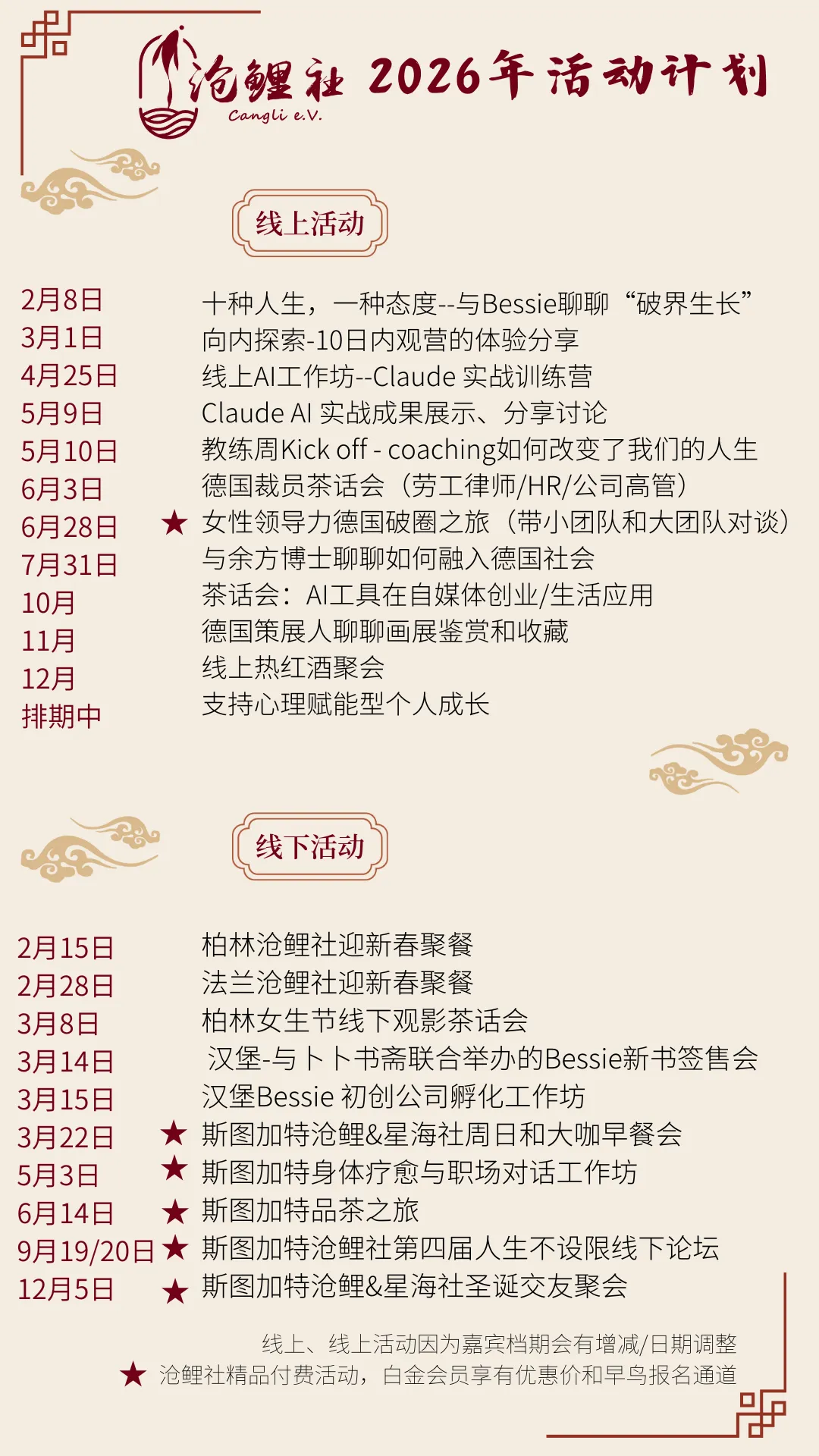沧鲤社是由在德国的华人女性成立的,为德国及欧洲的华人女性服务的非营利协会,其愿景是打造一个互助、包容和温暖的线上与线下社区,赋能华人,尤其是女性华人,在异乡职场的成长和蜕变。