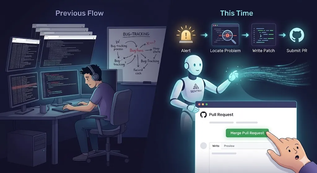 告警弹出。 开发者打开日志,阅读报错信息。 定位问题,编写修复代码。 提交 PR,等待 Review,最后合并。 (整个过程通常耗时半天到两天)