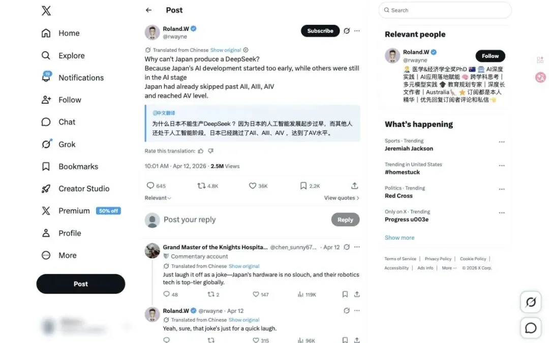 摘要:3.6 万赞的推文说"日本造不出 DeepSeek 是因为起步太早,直接从 AI 跳到了 AV"。笑完之后发现,这可能是今年最精准的行业诊断。