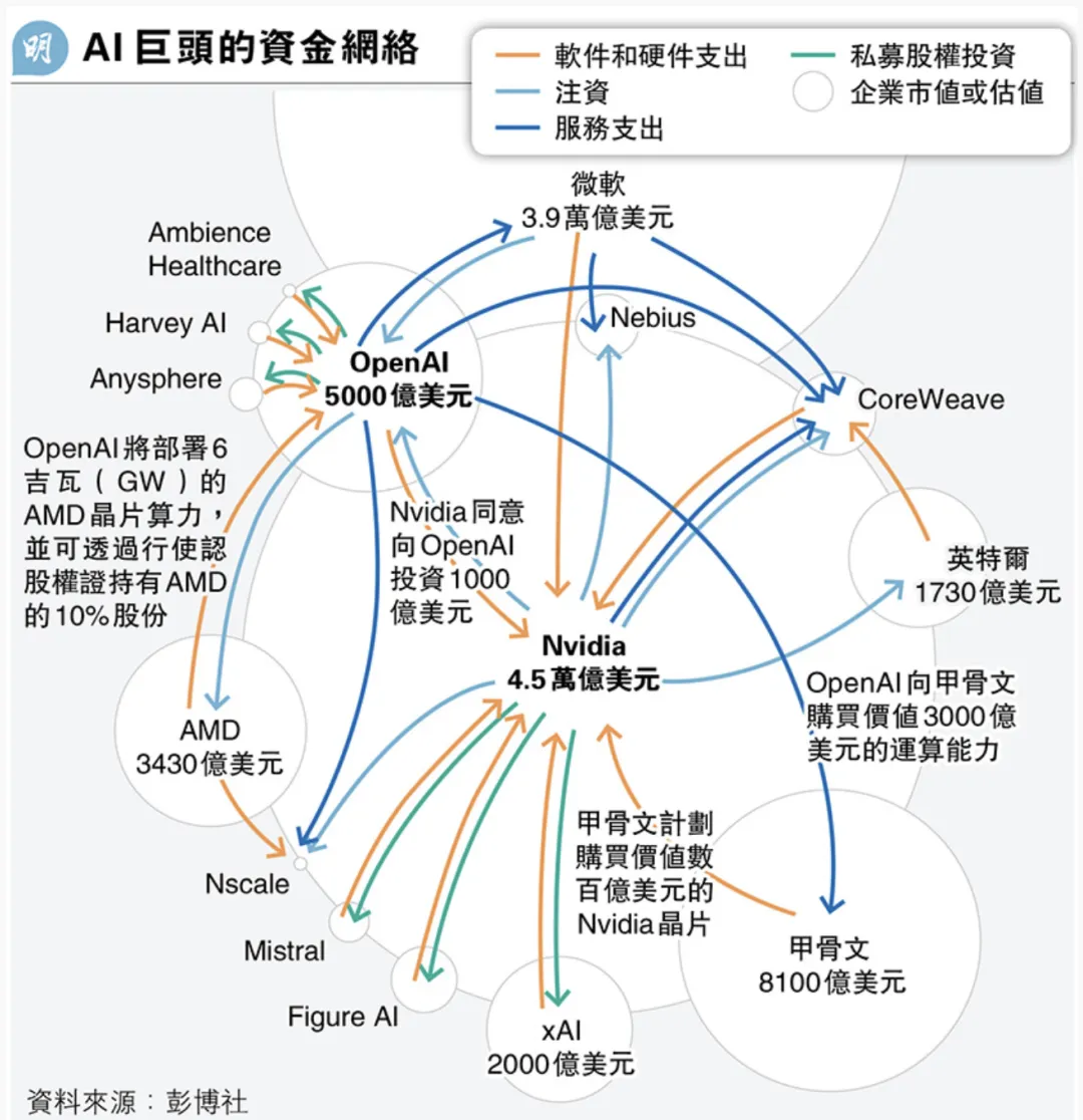 美股的AI神话,快要讲不下去了 美国的AI故事,几乎把所有赌注都押在了一个终极目标上——构建“通用人工智能”。但问题就在于,这条路,巨烧钱,而且没有一条清晰的路径。 正常情况下,一项技术从诞生到成熟,它的不确定性会越来越低,商业前景会越来越清晰。比如互联网,从发电子邮件到电子商务,路径很清楚。但AGI不一样,你不停地往里面砸最先进的算力芯片,砸天文数字的研发费用,但路的尽头是什么?没人知道。 2025年以来,美国GDP增长的92%,都来自于AI的巨额投资。但这钱花了,那些搞AI大模型的企业和部署AI应用的企业都挣到钱了吗? 估值快一万亿美元的OpenAI,光是2025年上半年,净亏损就达到了135亿美元。麦肯锡的调研也佐证,近80% 部署了AI的企业,净利润并没有因此提高。Meta2025年前三个季度利润是370亿美元,而扎克伯格却宣布要在AI上砸600亿美元,挣的太慢花的太快,利润不够投资,钱从哪来? 他们有9种办法搞到天量的资金,又不让财报不那么难看。 最直接的是成立SPV空壳公司,这个干儿子替主子借钱,购买GPU建设数据中心,然后长期出租给主子使用。这样资产和债务都在这家SPV账上,亲爹的财务报表上只体现稳定的租金费用,而不是资产折旧和债务利息。 也可以战略结盟互帮互助,看一下彭博社分析的几个AI巨头的资金网络: 造GPU显卡的,建云平台AI数据中心的,还有做AI大模型的几个巨头互相投资利益捆绑,左手倒右手,营收和GDP就都出来了。 更绝的是,美国现在建了越来越多的数据中心,这些数据中心的长期租约,被打包成债券,卖给市场。这像极了次贷危机前把房贷打包的操作,埋下了隐形杠杆的雷。 当前这种支出过度、回报过低的情况,将债务泡沫隐藏进资本市场的一片繁荣之中。这些财团都经历过互联网泡沫和2008年的次贷危机,不会对泡沫无动于衷,2008年房地产市场崩盘,当年的一批空壳公司持有的资产变成毒药,引爆了金融海啸。 这次的AI融资和次级贷款一样吗?不一样的是这次底层资产是真实的高价值的GPU硬件,搞SPV的目的是为了隔离风险和优化报表而不是隐匿亏损或欺诈。但是一样的地方在哪里呢,资本的贪婪! AI芯片是有生命周期的,今年抢购的GPU,可能在18个月之后就会新版本的出现而被淘汰,一旦有人因技术路线失败或者竞争失利出现违约,这个链条就会出现连锁反应。- 赌中国会跟随他们的技术路线,而英伟达和美国大总统配合唱双簧,他们国内落后一代甚至是二手的GPU能卖给中国。