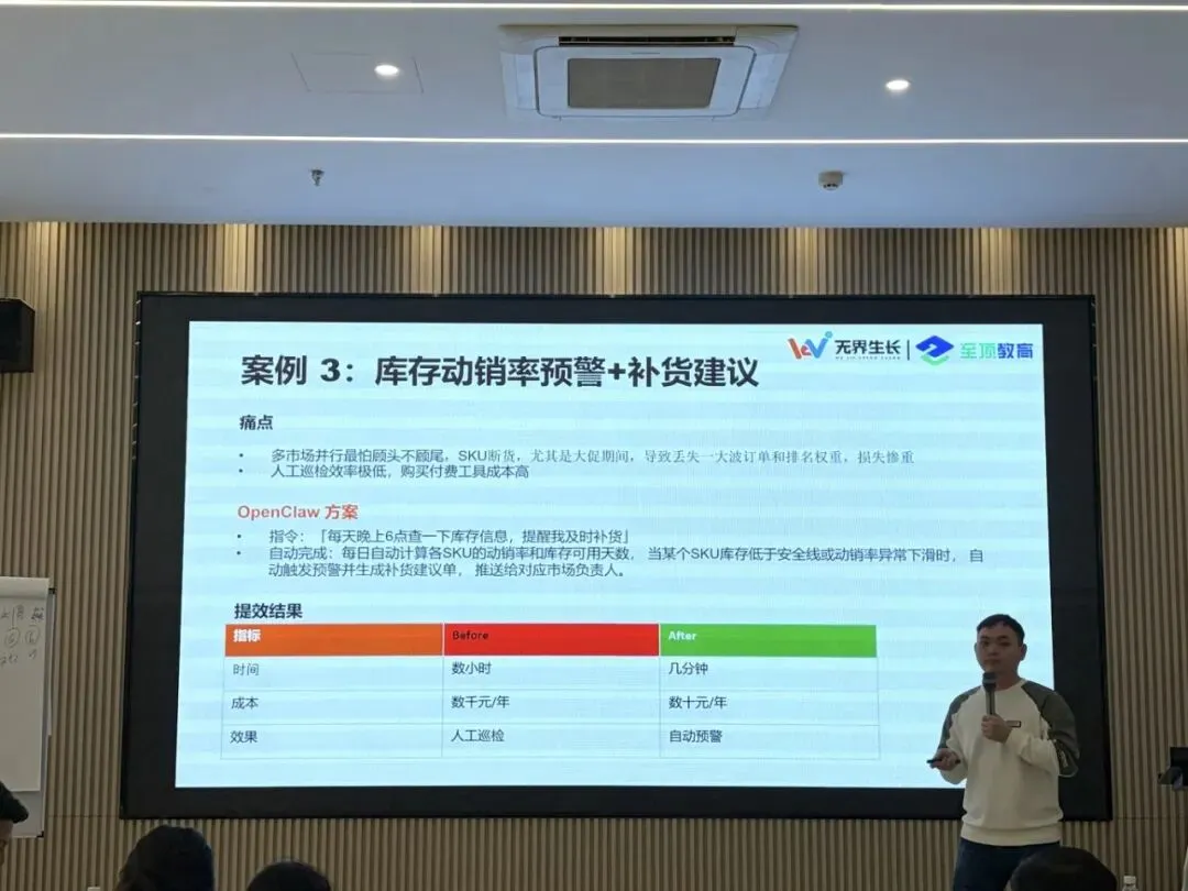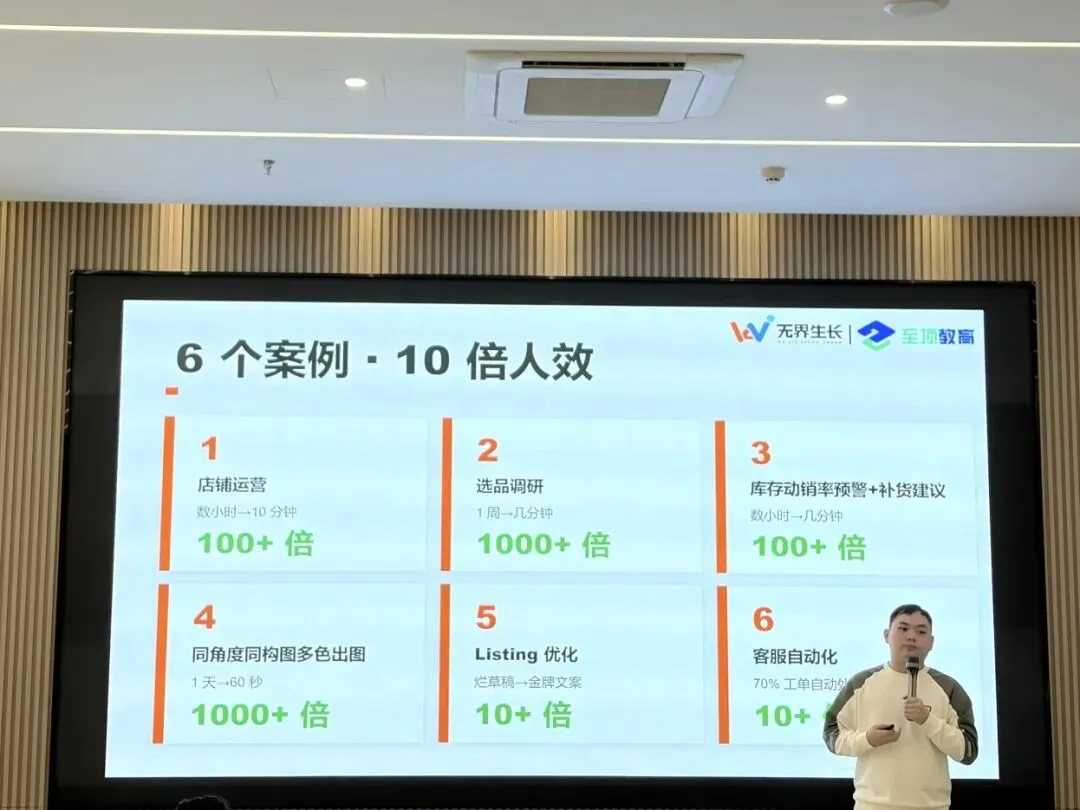 课程分享了AI赋能的完整路径:认知上,借助乔哈里视窗模型,明确需在隐藏区域(将人的经验教给AI)与盲点区域(利用AI发现未知规律)主动作为;能力上,将重心从执行力转向“会提问”与“懂评估”两大元能力;进而落地到电商“选品、客服、内容运营”等七大高价值、高重复性具体场景;最终通过“店铺运营、选品调研、Listing优化”等六个真实案例,验证了从十倍到千倍的惊人效率提升。