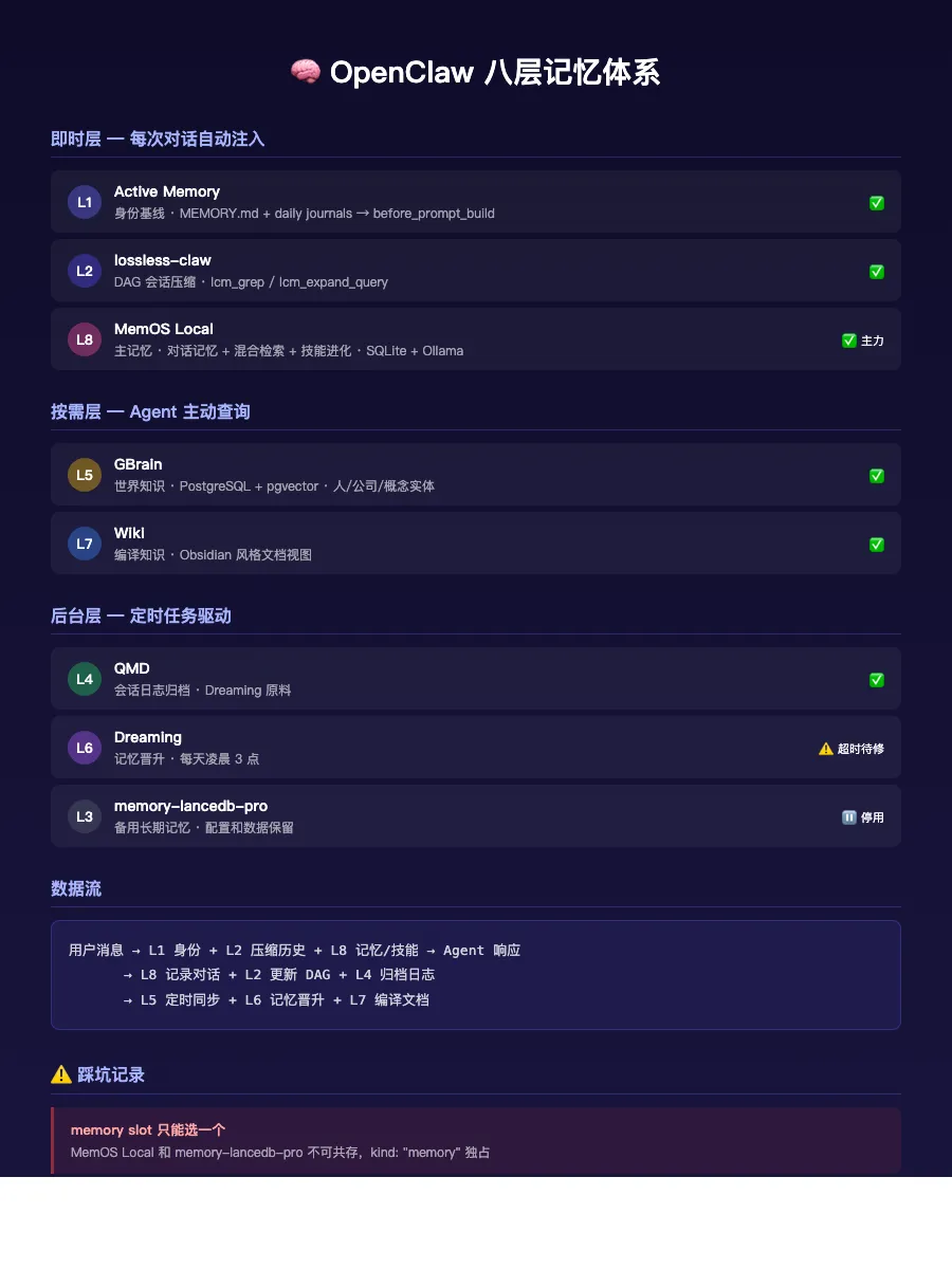 用户消息到达 │ ├─ L1 Active Memory 注入身份/长期背景 ├─ L2 lossless-claw 注入压缩会话历史 ├─ L8 MemOS Local 注入相关记忆/任务/技能上下文 │ ▼Agent 响应 │ ├─ L8 MemOS Local 记录对话、更新记忆、推进技能演化 ├─ L2 lossless-claw 更新 DAG 压缩结构 ├─ L4 QMD 归档原始会话日志 │ ▼后台 │ ├─ L5 GBrain 定时同步显式知识 ├─ L6 Dreaming 选择高价值内容晋升 └─ L7 Wiki 编译结构化文档各层去重分工