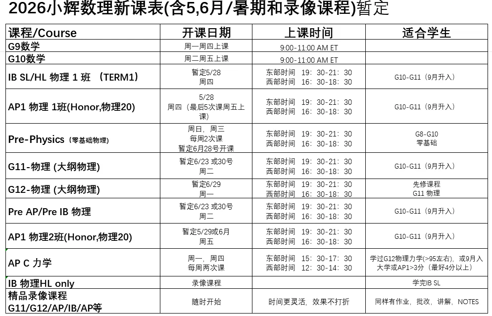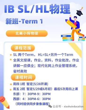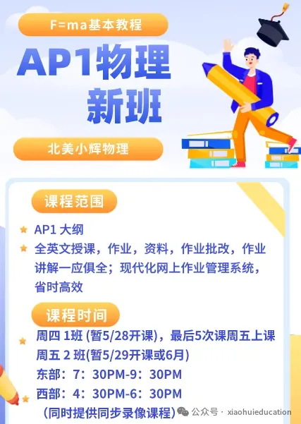 小辉物理创于北美,立足北美, 专注于北美高中物理教学, 提供AP, IB,大纲物理,零基础物理和竞赛物理等优质专业服务,小辉微信:WJK03980398 。请参考文末2026最新课表(含暑假课程)