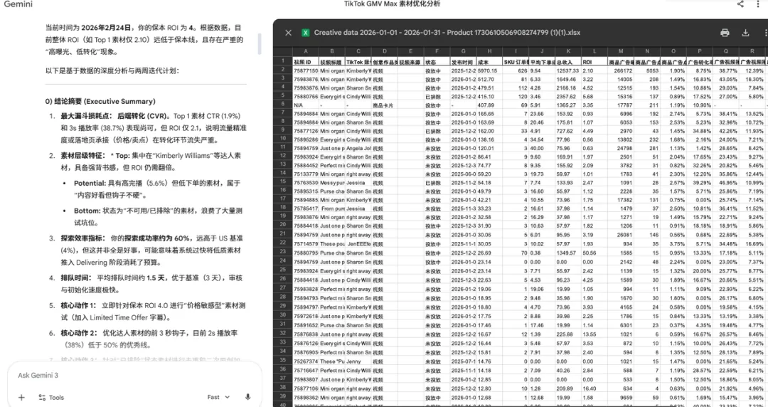 通过特定的提示词指令,Gemini 能直接识别出“高点击、低意图”的赔钱素材