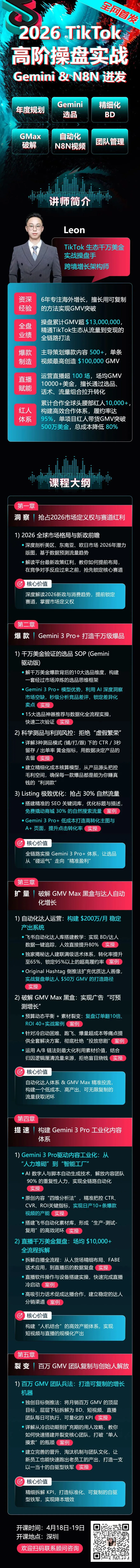 4月18号-19号 我们请到了LEON老师给大家准备了一场 TikTok & Gemini 3 Pro 高阶操盘手 实战课